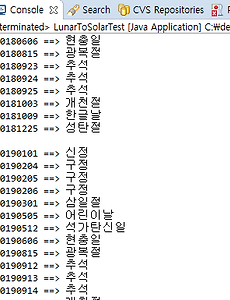 분류 전체보기98 Java로 달력을 만들어 봅시다. 자바로 달력을 표시하기 위해서는 1일이 무슨 요일인지 알아야 하며(정확히는 요일에 해당하는 숫자를 알아야 한다.) 해당 월의 마지막 날짜를 알아야 한다. (마지막 날짜는 무조건 31일로 정해진것이 아니기 때문에...) 그리고 달력처럼 칸을 나누어 출력할 경우에는 마지막 날짜가 평일인경우 마지막 날짜로부터 주말이 될때까지 빈칸도 표시해주어야 하므로 해당 월의 주가 몇주가 있는지 알아야 한다. 그래야 for 문을 이용하여 loop 횟수를 구할 수 있다. 아래는 해당 월이 몇주까지 있는지 확인하는 소스이다.Calendar cal = Calendar.getInstance(); // iYear : current Year, iMonth : current Month (january is 0), 1 : one day .. 2016. 1. 27. Java를 이용하여 2016년부터 2030년까지 공휴일 데이터 조회해보자 아래 포스팅된 Java를 이용하여 음력과 양력 변환하기 를 이용하여 2016년 부터 2030년까지 공휴일을 조회해보자 소스는 아래와 같다.package javatest; import java.io.IOException; import java.text.SimpleDateFormat; import java.util.Calendar; import java.util.Date; import java.util.HashMap; import java.util.Map; import com.ibm.icu.util.ChineseCalendar; public class LunarToSolarTest { public static Map solarHolidayMap = new HashMap(); public static Map .. 2016. 1. 26. Java를 이용하여 음력과 양력 변환하기 Database에 휴일을 집어넣고 일정을 표시해줄때 공휴일을 표시해줄 경우가 있다. 양력으로 되어있는 일반 공휴일은 처리하기가 간단한데 음력으로 되어있는 공휴일 (예를 들어 설날 또는 추석)은 음력 데이터가 있어야 한다. 그래서 인터넷에 있는 음력데이터를 이용하여 디비에 넣고 확인을 해보니 음력 날짜가 맞지 않다. 그래서 구글에서 검색해보니 java를 이용하여 양력과 음력을 변환할 수 있는 소스가 존재했다. 아래는 소스이다. import java.text.SimpleDateFormat; import java.util.Calendar; import java.util.Date; import com.ibm.icu.util.ChineseCalendar; public class LunarToSolarTest { .. 2016. 1. 26. Oracle timestamp 값을 date 형식으로 변환하기 Oracle에서 unixtimestamp 값 조회 하기 SELECT (SYSDATE - TO_DATE('01-01-1970 00:00:00', 'DD-MM-YYYY HH24:MI:SS')) * 24 * 60 * 60 FROM DUAL Oracle에서 unixtimestamp 값을 date 형식으로 변환하기SELECT TO_DATE('19700101','yyyymmdd') + ((1453337882791/1000)/24/60/60) result_date from dual; 2016. 1. 21. 이전 1 ··· 15 16 17 18 19 20 21 ··· 25 다음